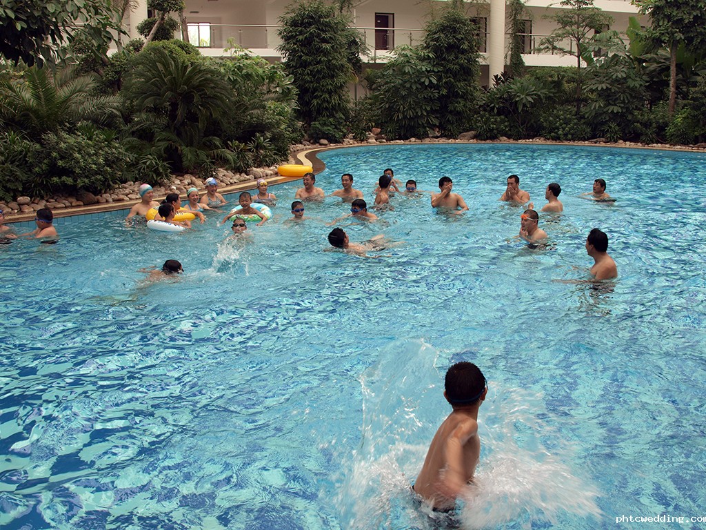 职工及家属在公司游泳池中嬉戏